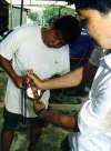 Inspecting gravid female by torchlight.