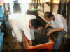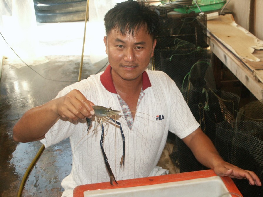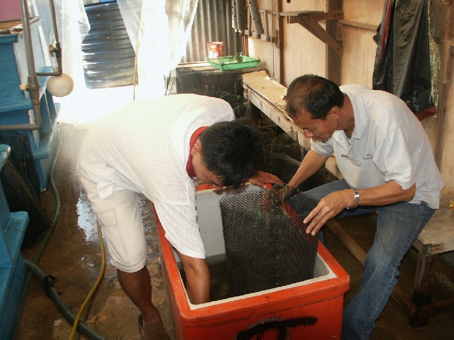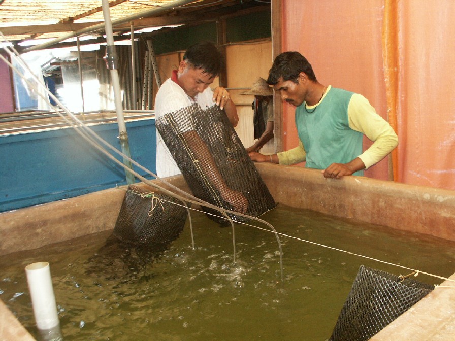 Inspection of Fresh water prawn brood stock. |